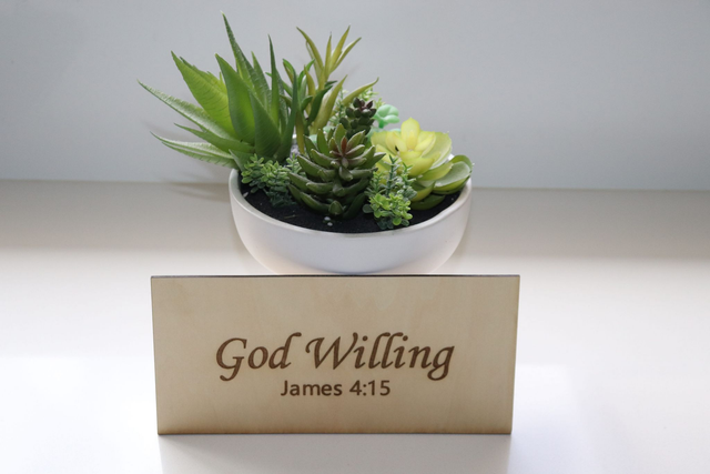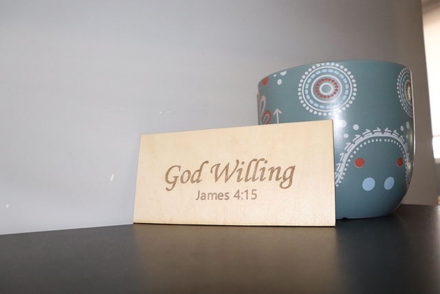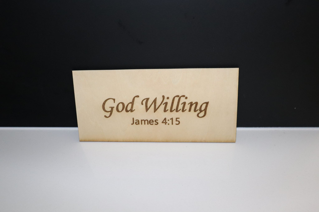 Add a meaningful touch to your home, office, or prayer space with this beautifully engraved wooden sign featuring the words “God Willing” and the scripture reference James 4:15. Simple, elegant, and timeless, this piece serves as a gentle reminder to place trust in God’s plans each day.